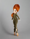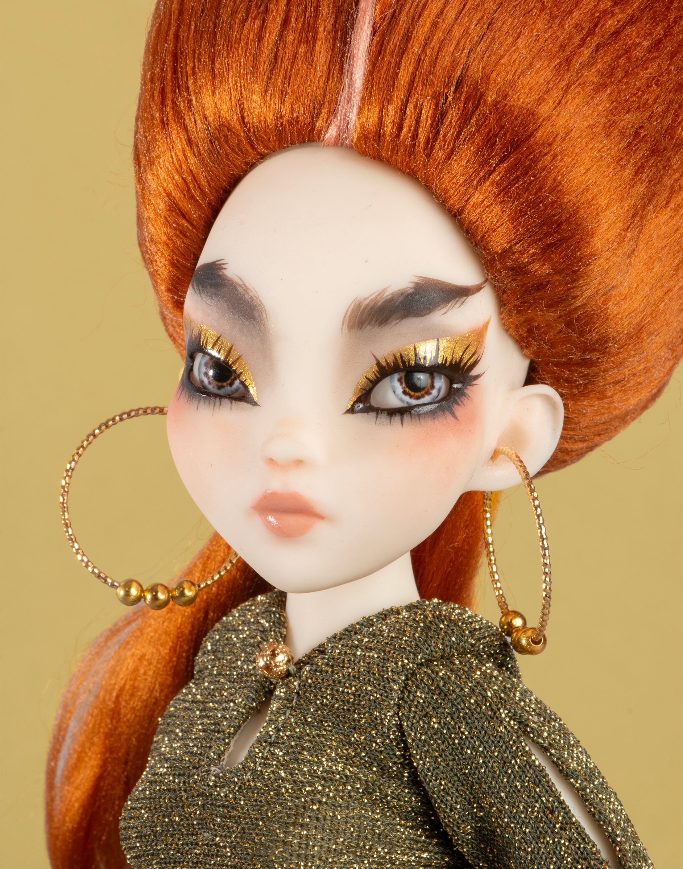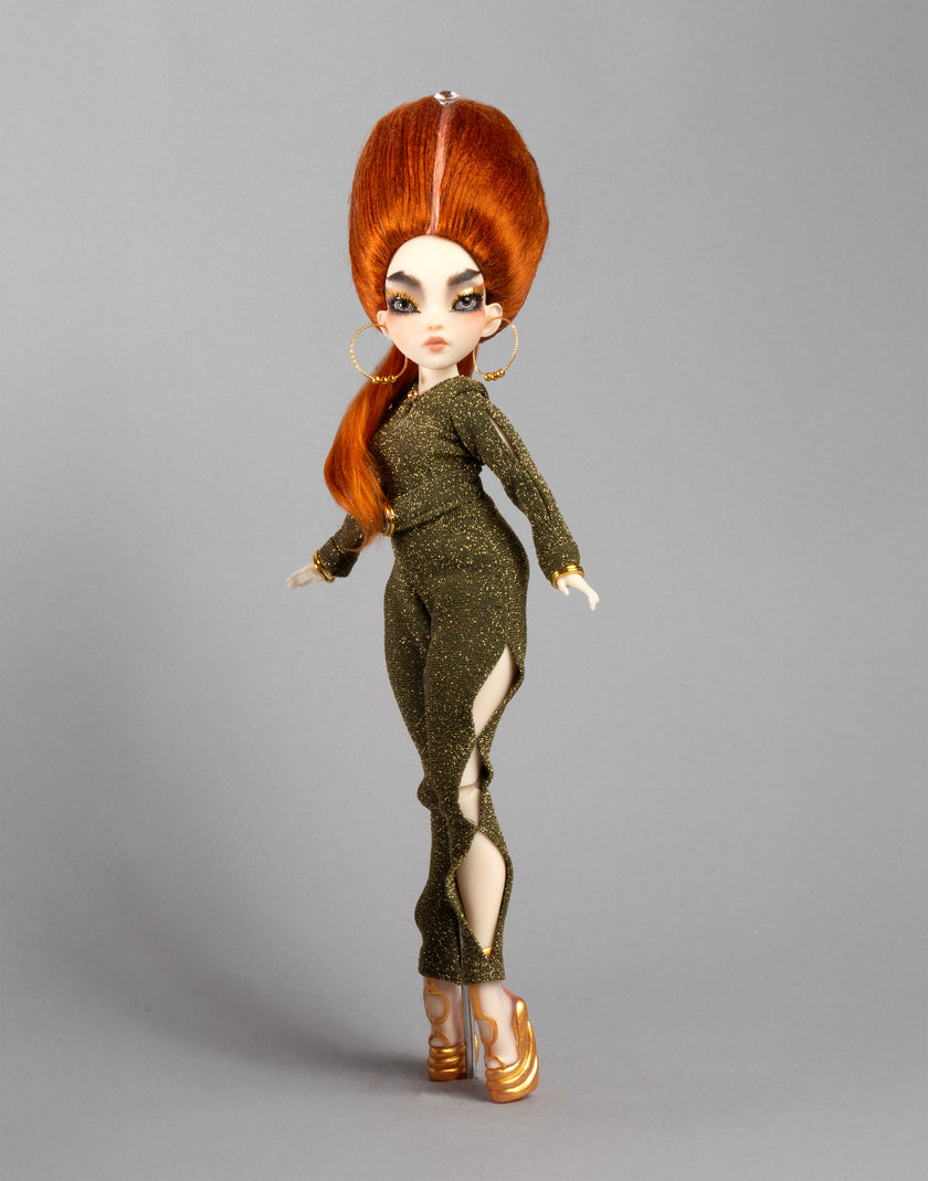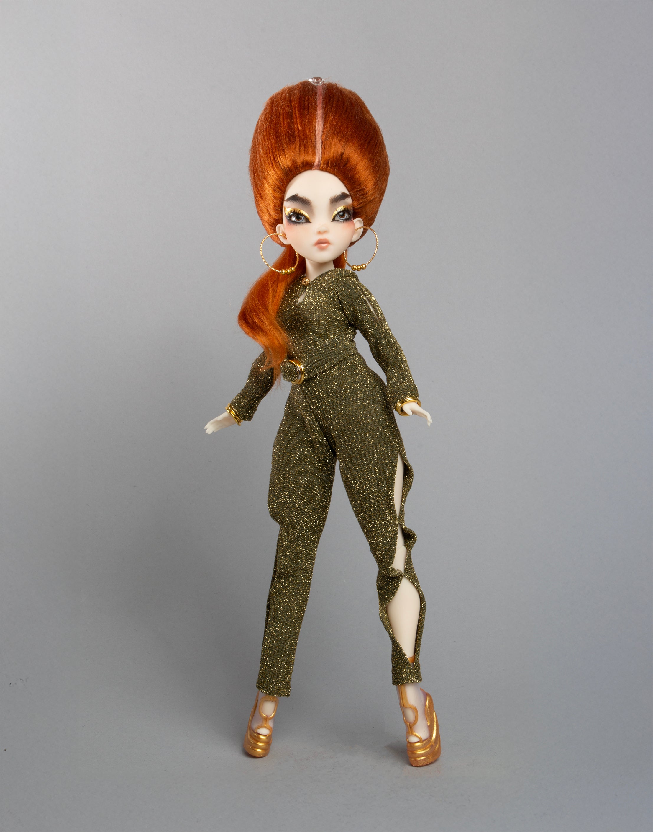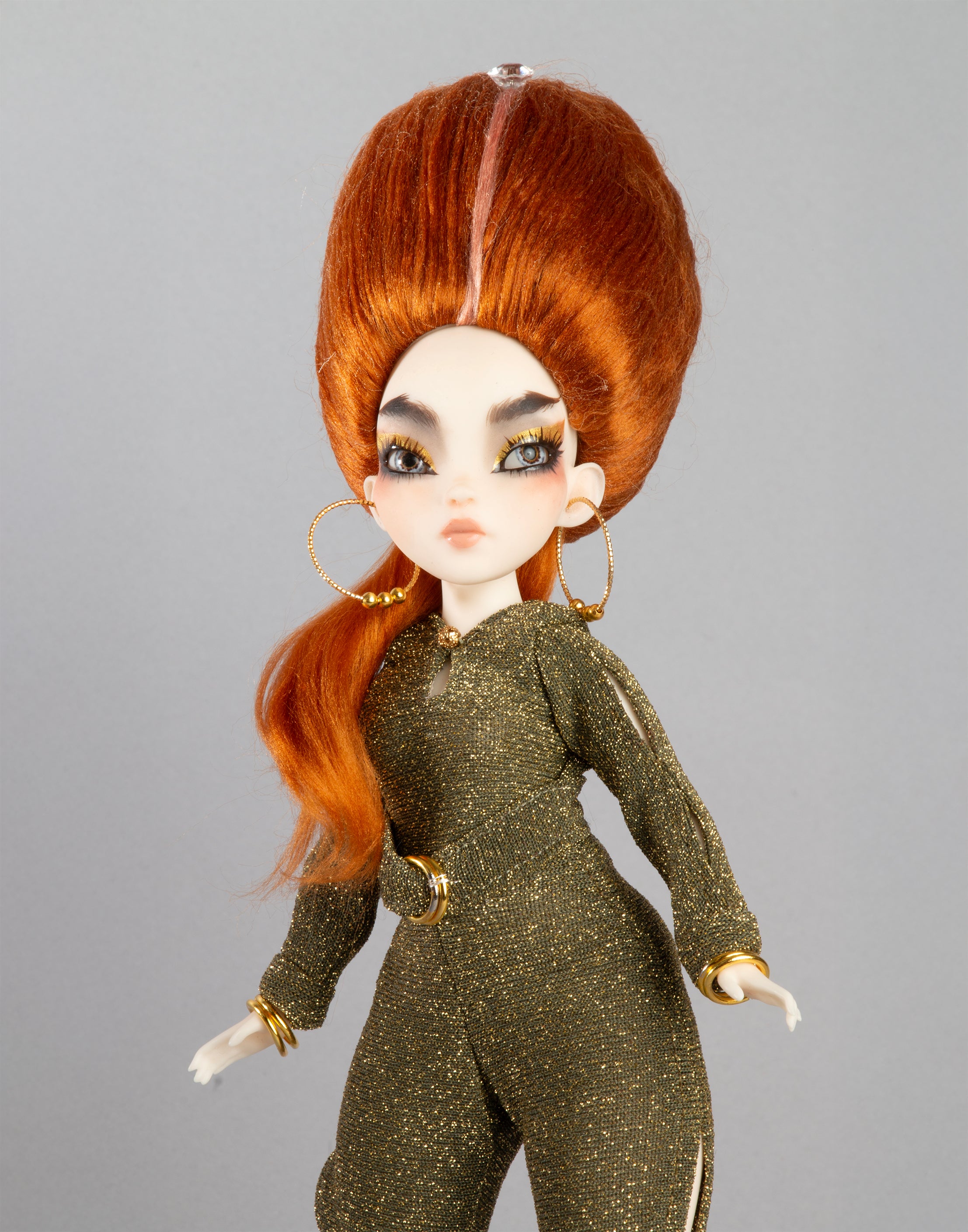 Hand-cast high-quality resin doll with 7 points of articulation internally strung with elastic; hand painted; inset acrylic eyes; removable handmade viscose fiber wig.