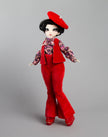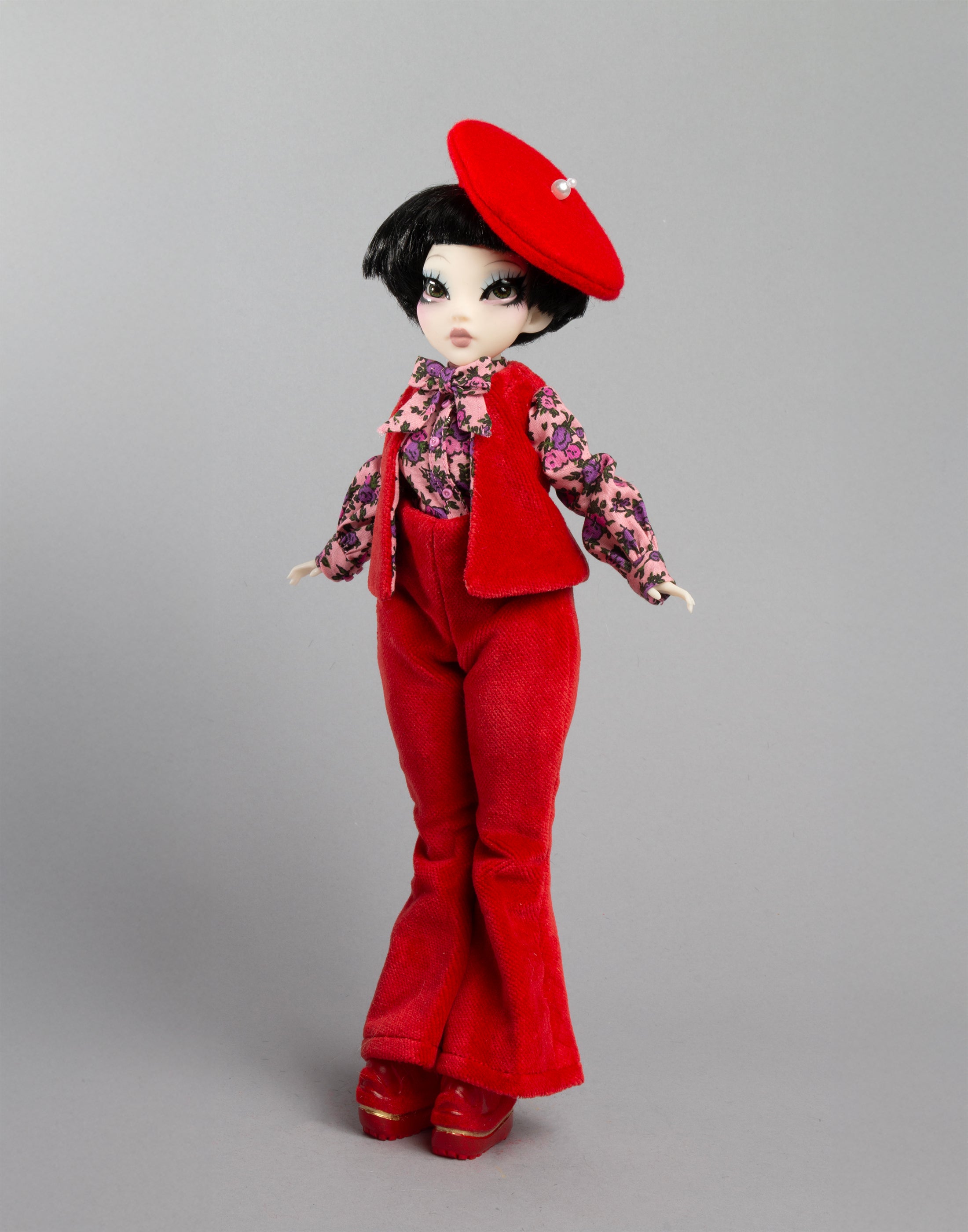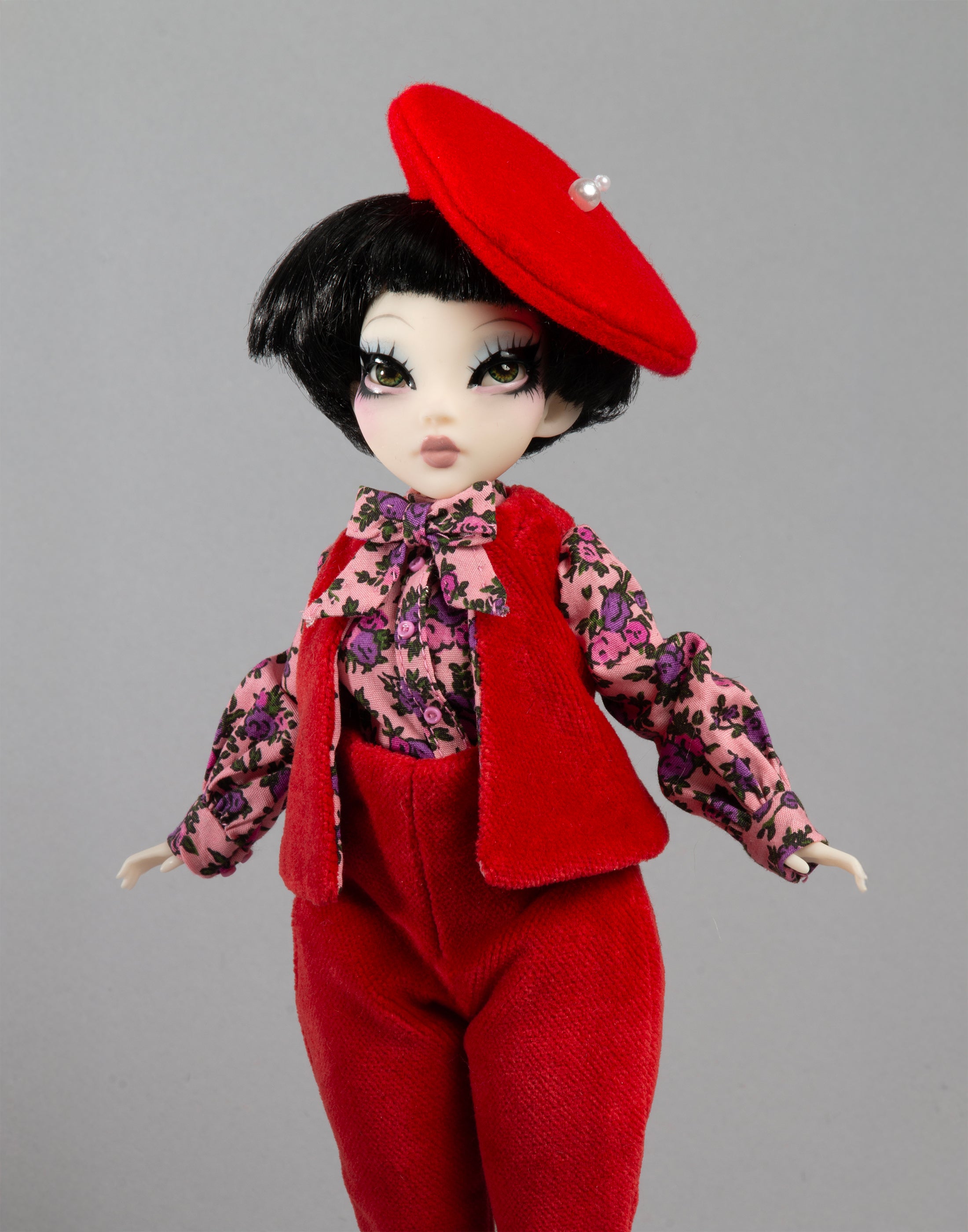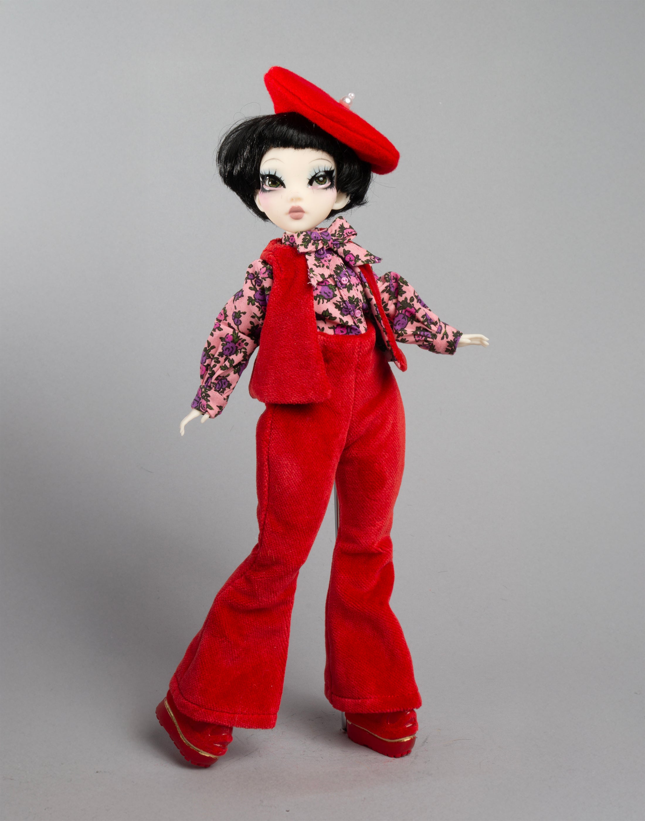 Red velvet bell-bottomed pants suit with vest; red felt artist beret with pearl detail; pink cotton ditsy floral blouse with pussy bow, 3D-printed flex-resin shoes embellished with gold acrylic paint and flocking.