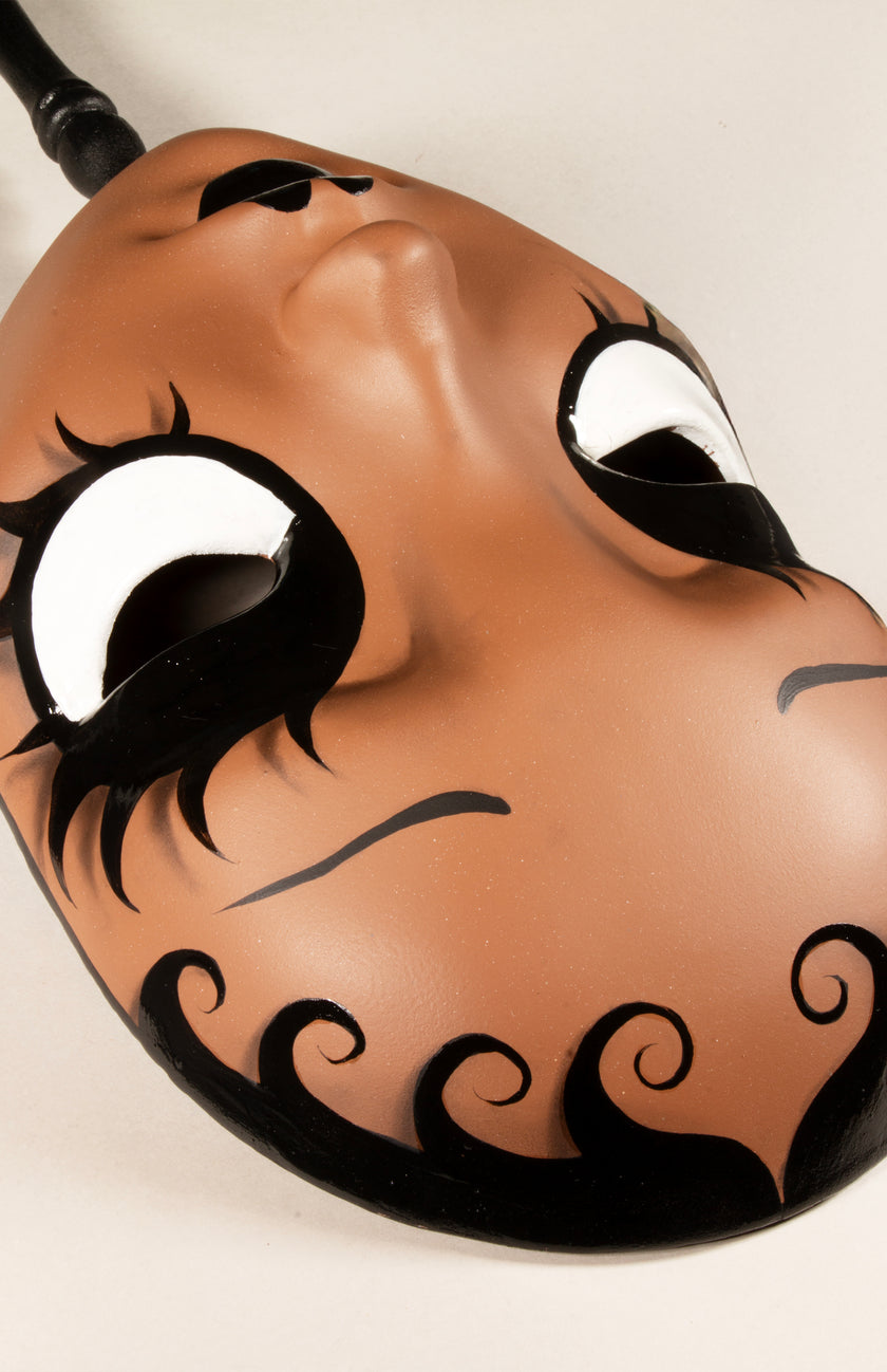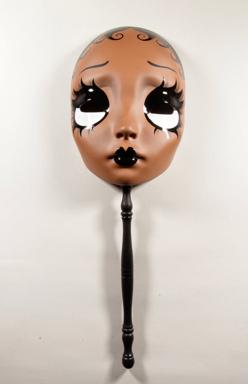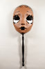Hand-cast resin mask; hand-painted with acrylic paint; wooden handle. Wired on back for wall display.