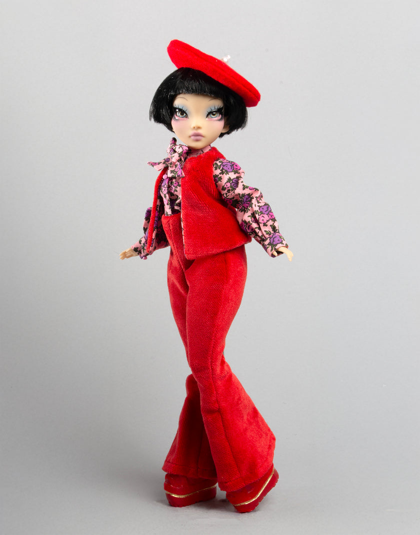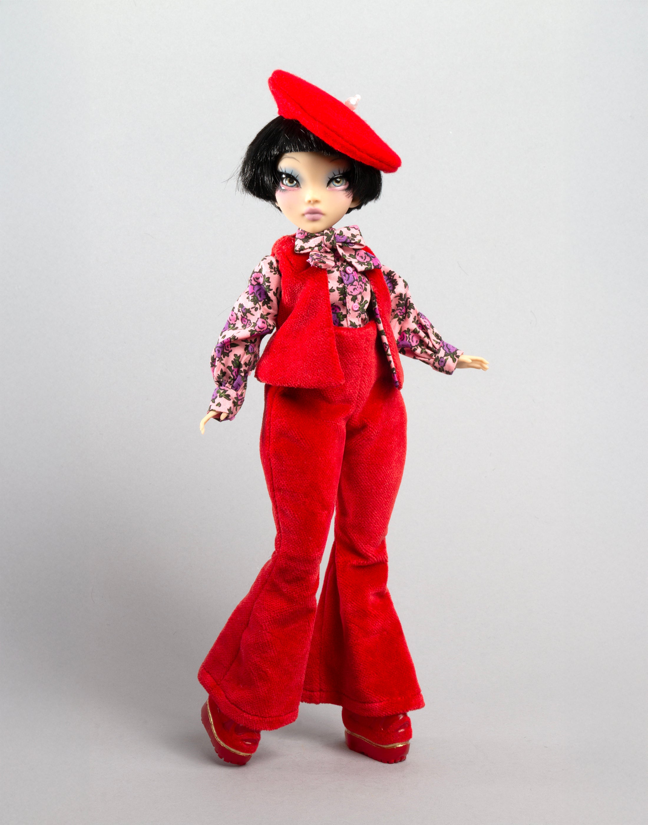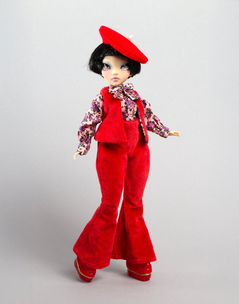 Red velvet bell-bottomed pants suit with vest; red felt artist beret with pearl detail; pink cotton ditsy floral blouse with pussy bow, 3D-printed flex-resin shoes embellished with gold acrylic paint and flocking.