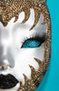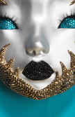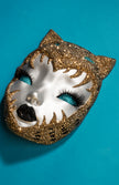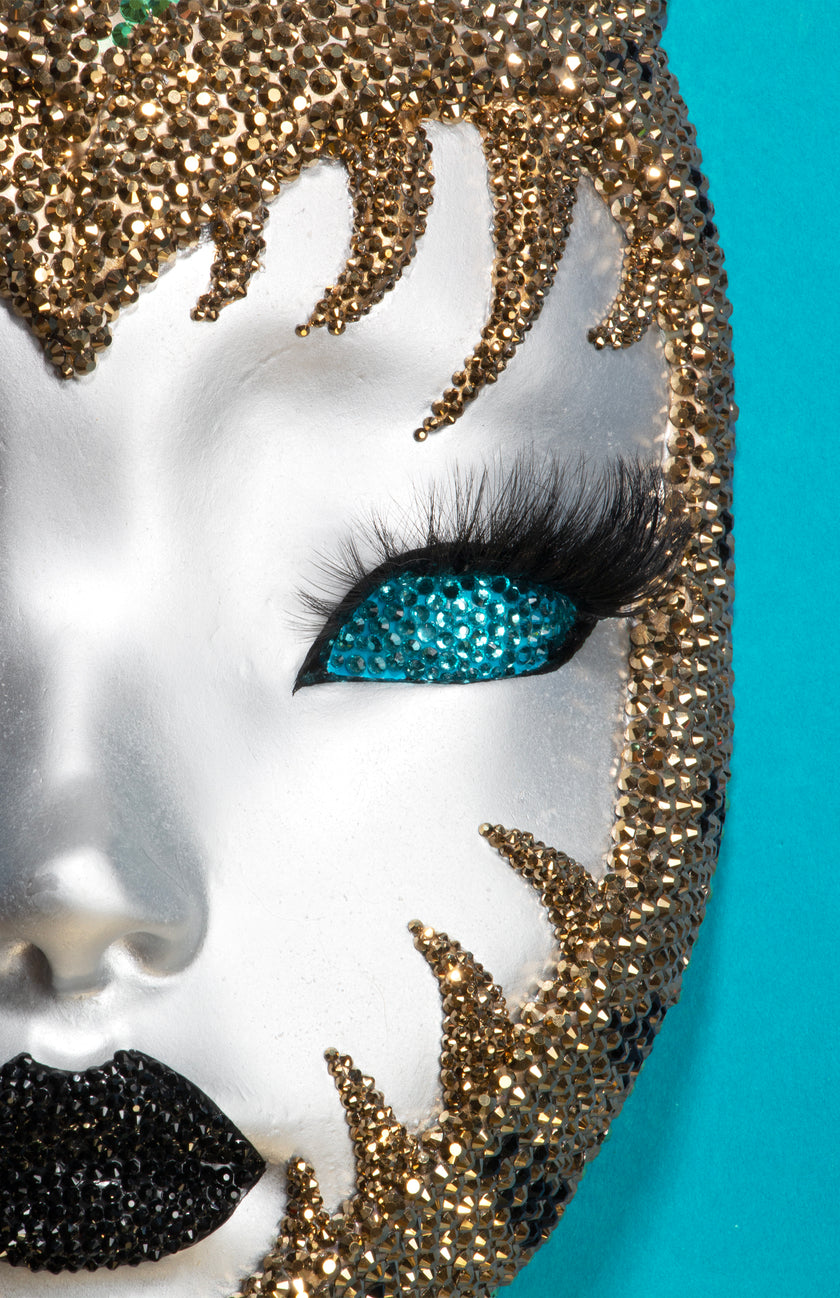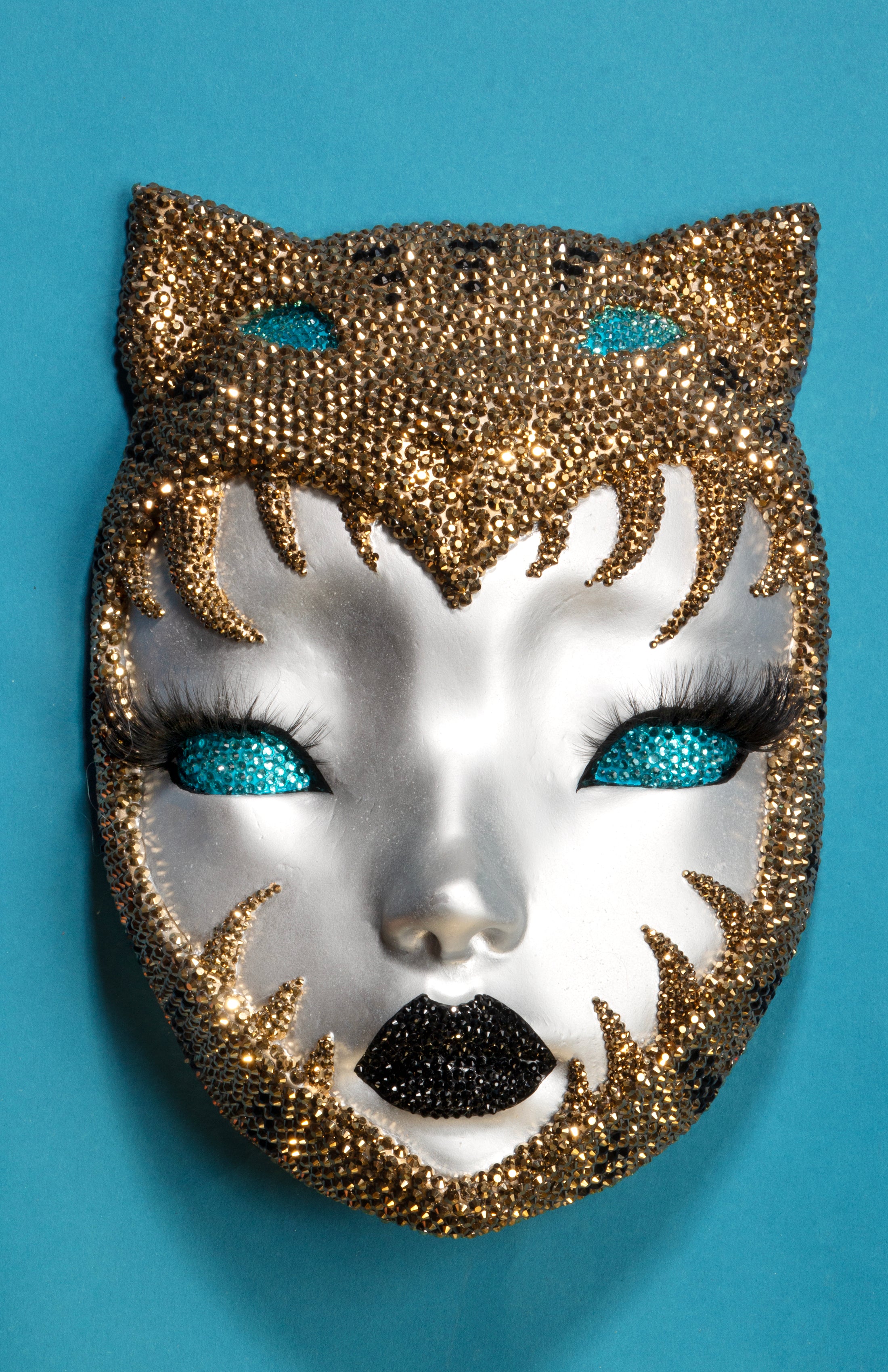 Hand-cast resin mask with hand-sculpted epoxy cat-face cowl; hand-painted with acrylic paint; metallic and crystal stoning; synthetic eyelashes. Wired on back for wall display.