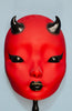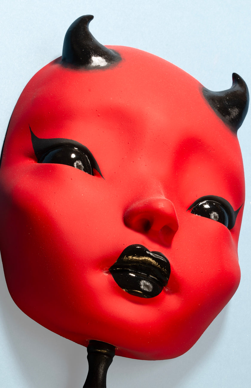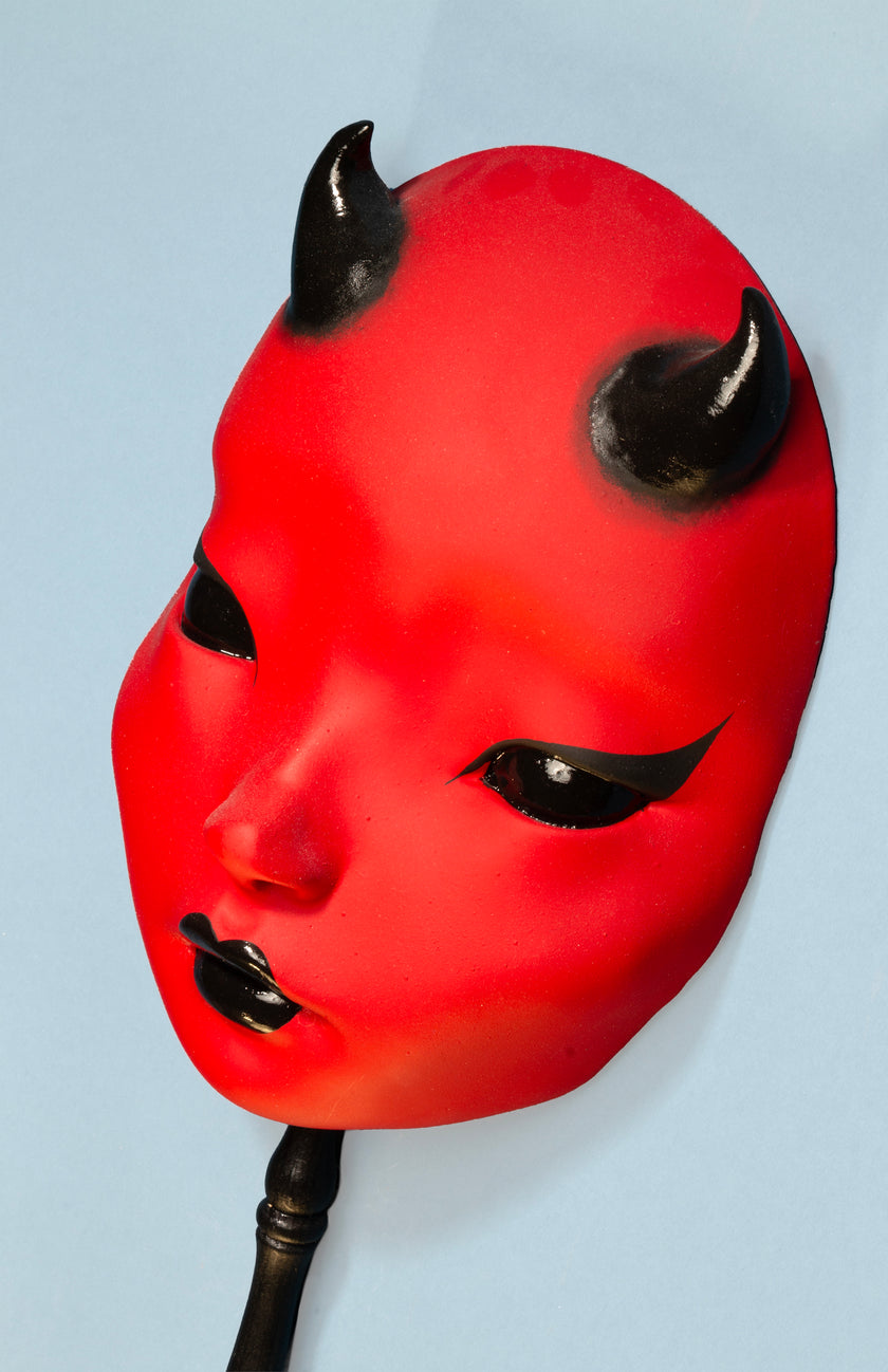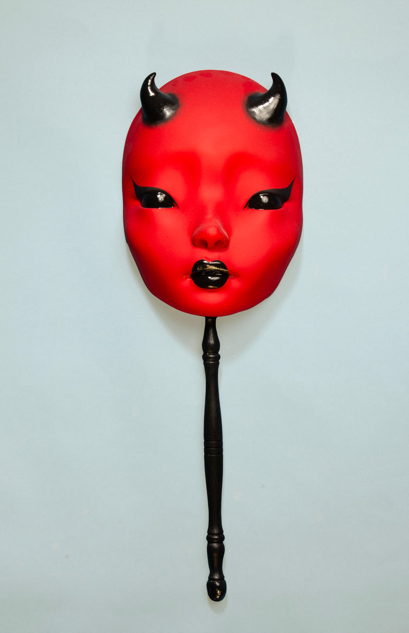 Hand-cast resin mask; sculpted epoxy horns; hand-painted with acrylic paint; wooden handle. Wired on back for wall display.