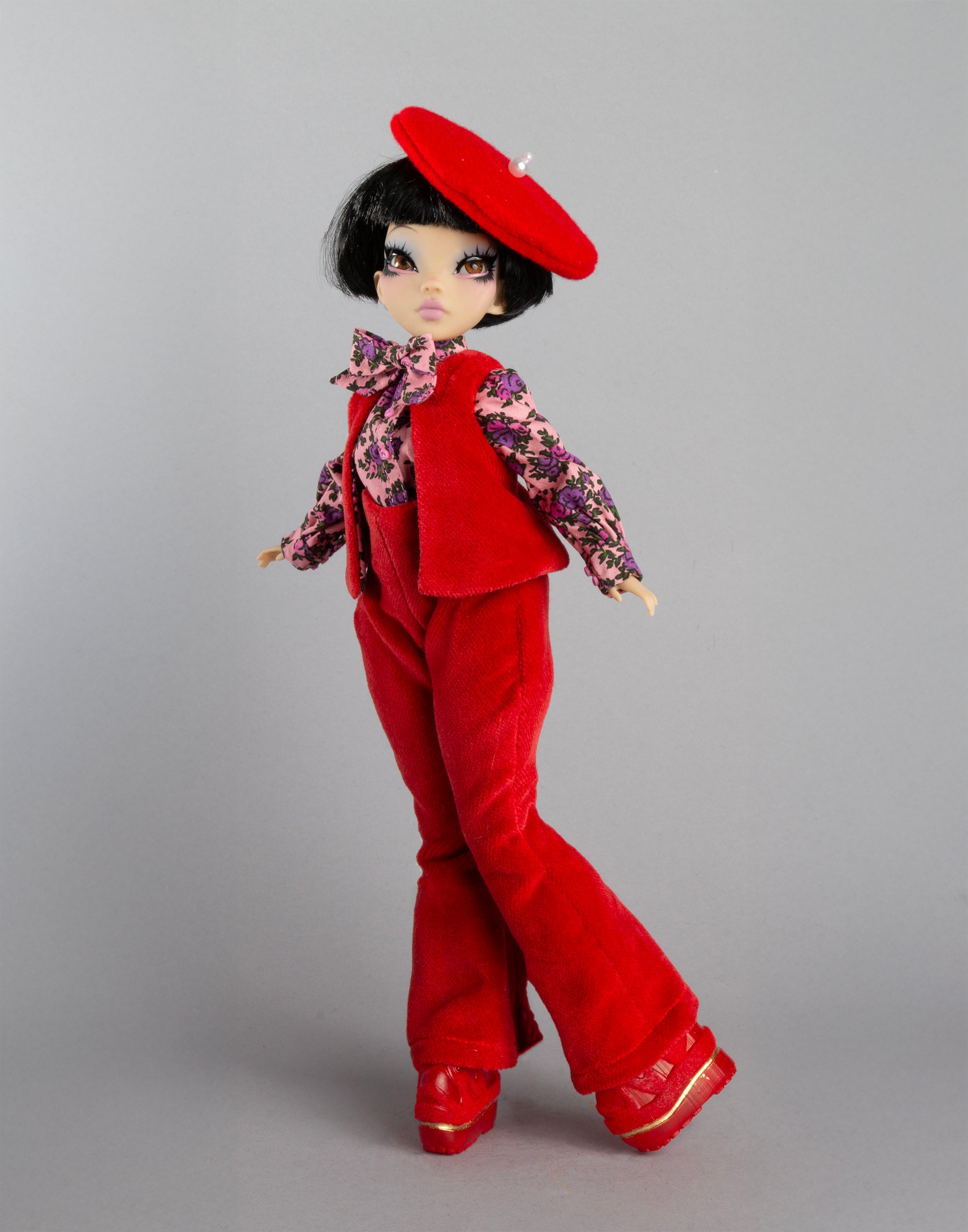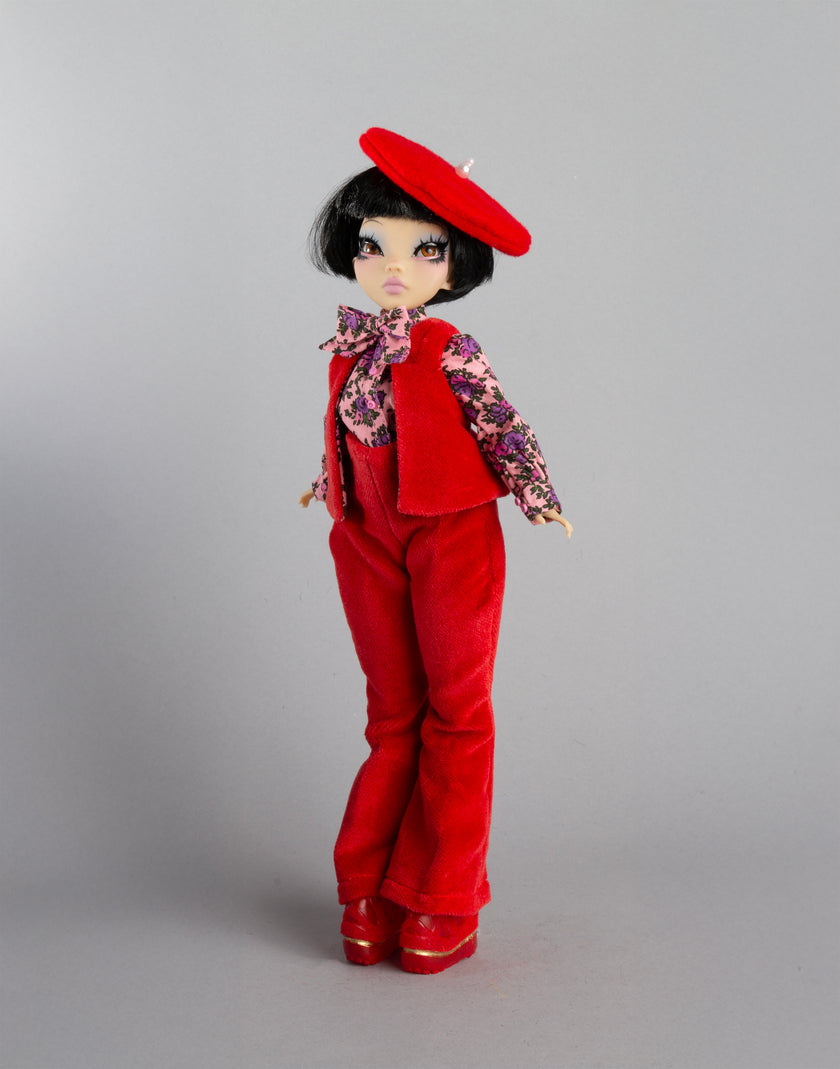 Red velvet bell-bottomed pants suit with vest; red felt artist beret with pearl detail; pink cotton ditsy floral blouse with pussy bow, 3D-printed flex-resin shoes embellished with gold acrylic paint and flocking.