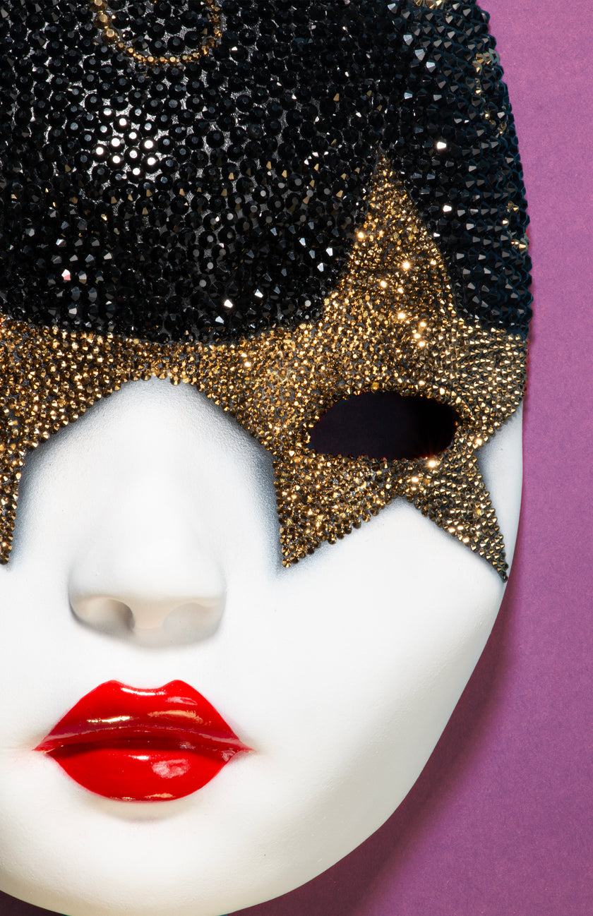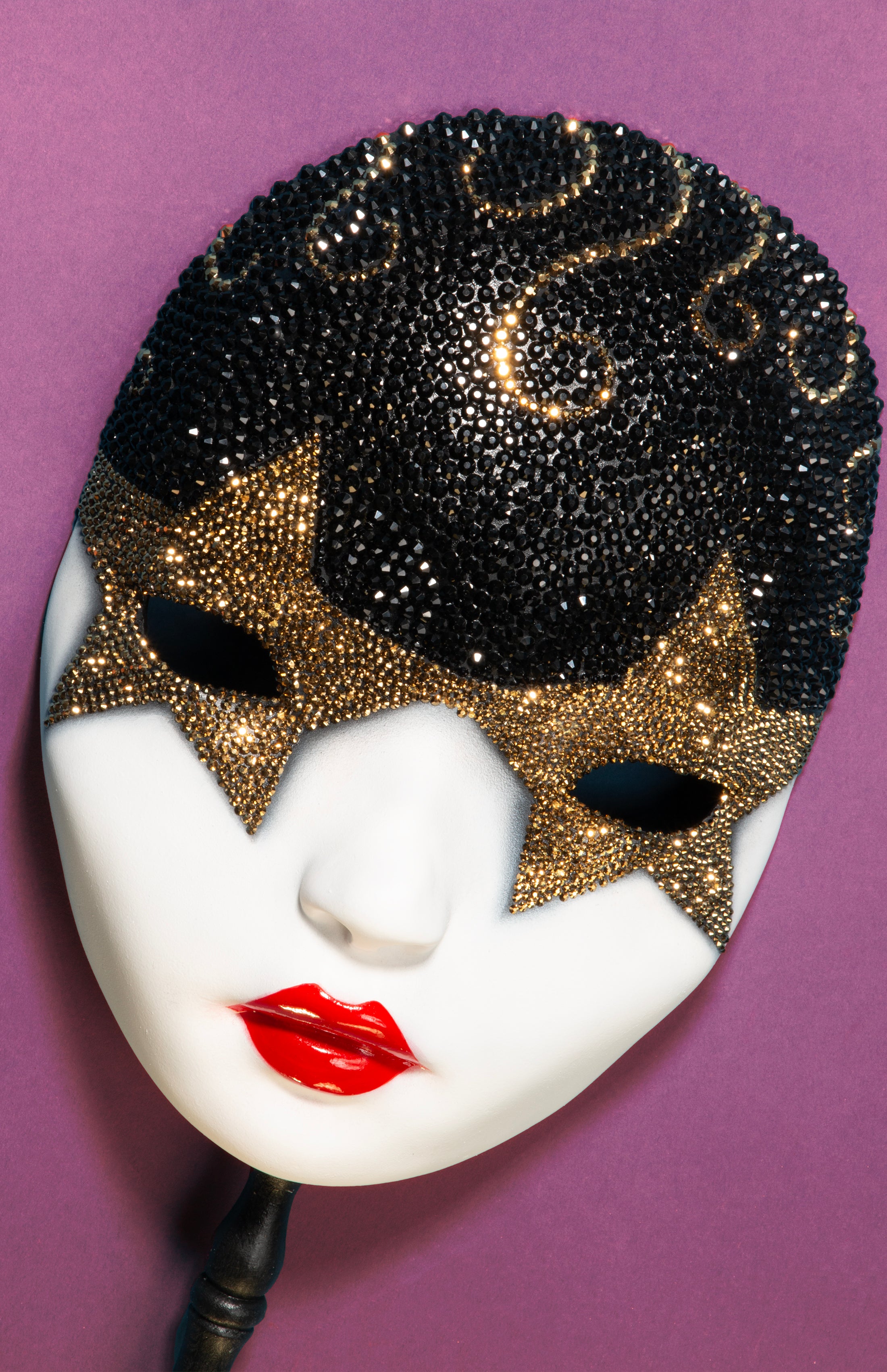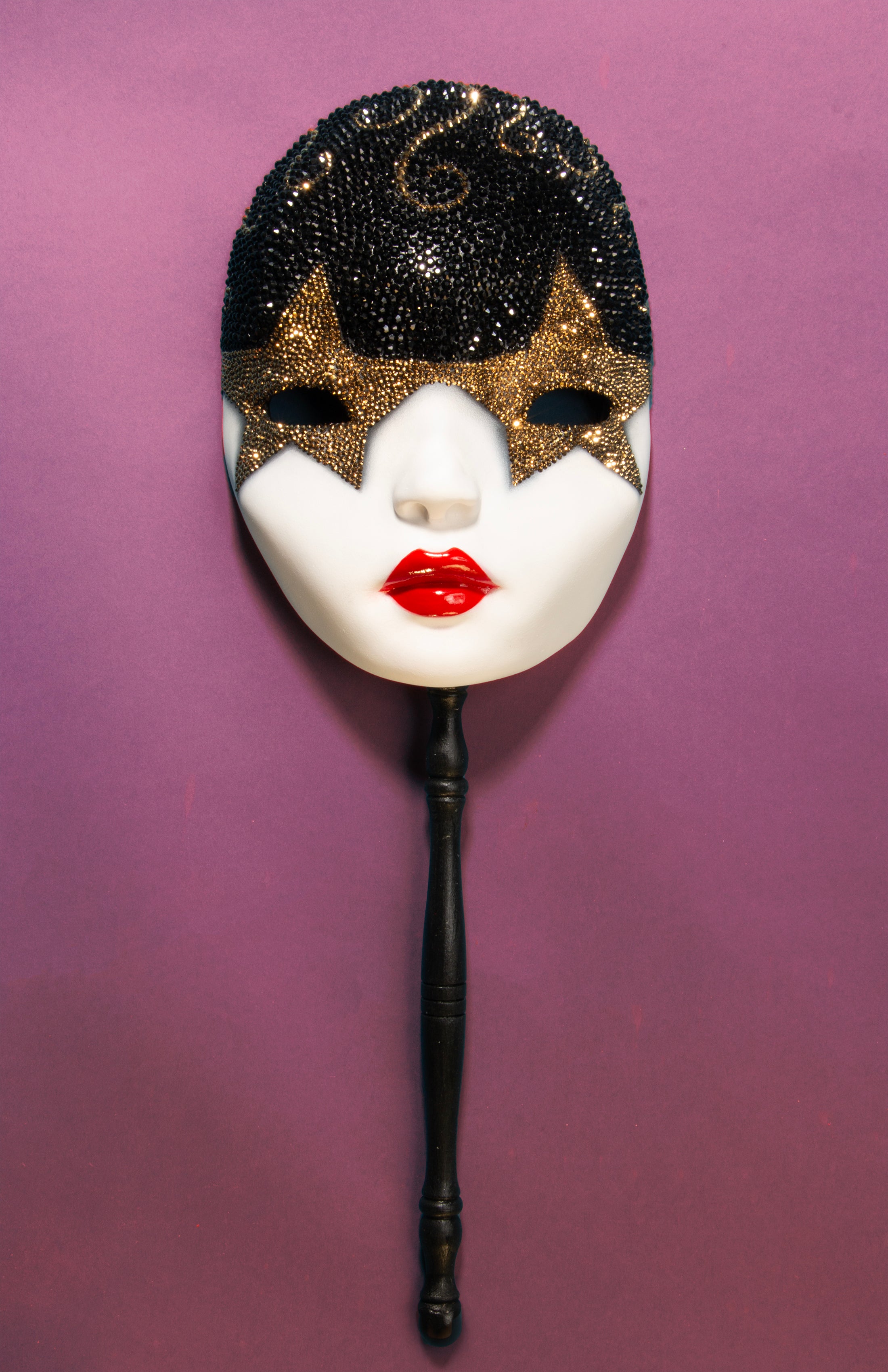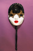 Hand-cast resin mask; hand-painted with acrylic paint; crystal stoning; wooden handle. Wired on back for wall display.