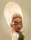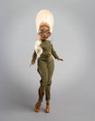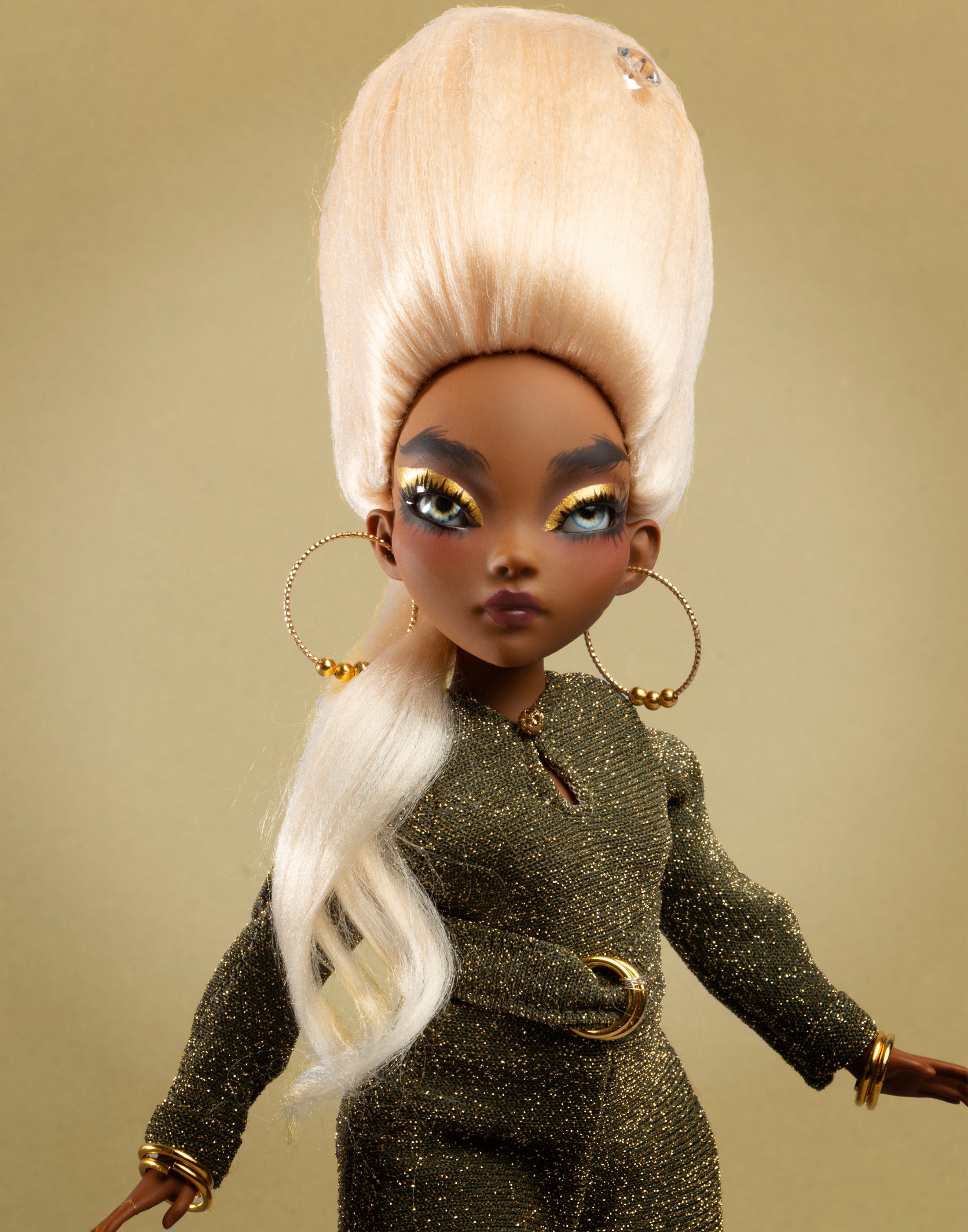 Hand-cast high-quality resin doll with 7 points of articulation internally strung with elastic; hand painted; inset acrylic eyes; removable handmade viscose fiber wig.