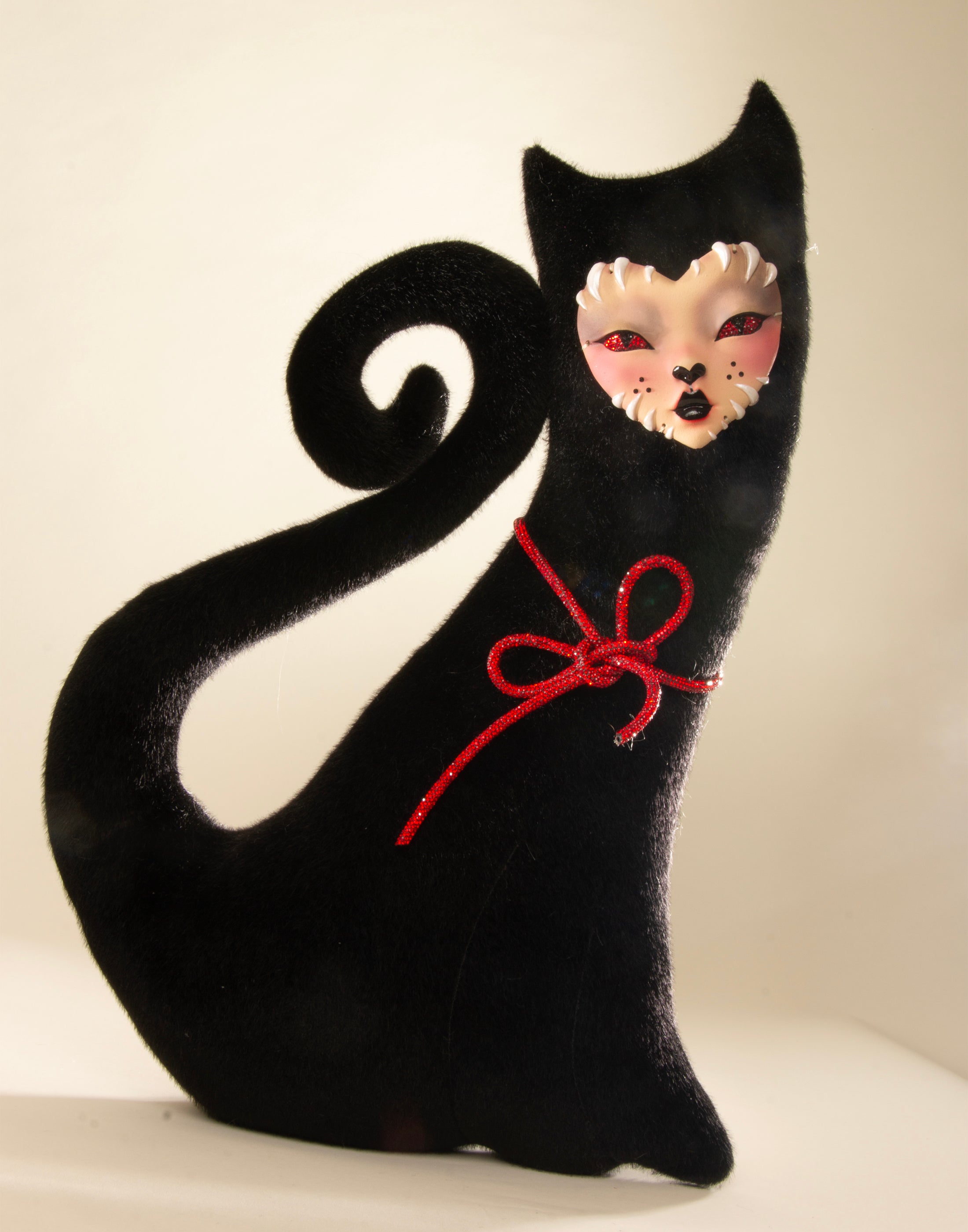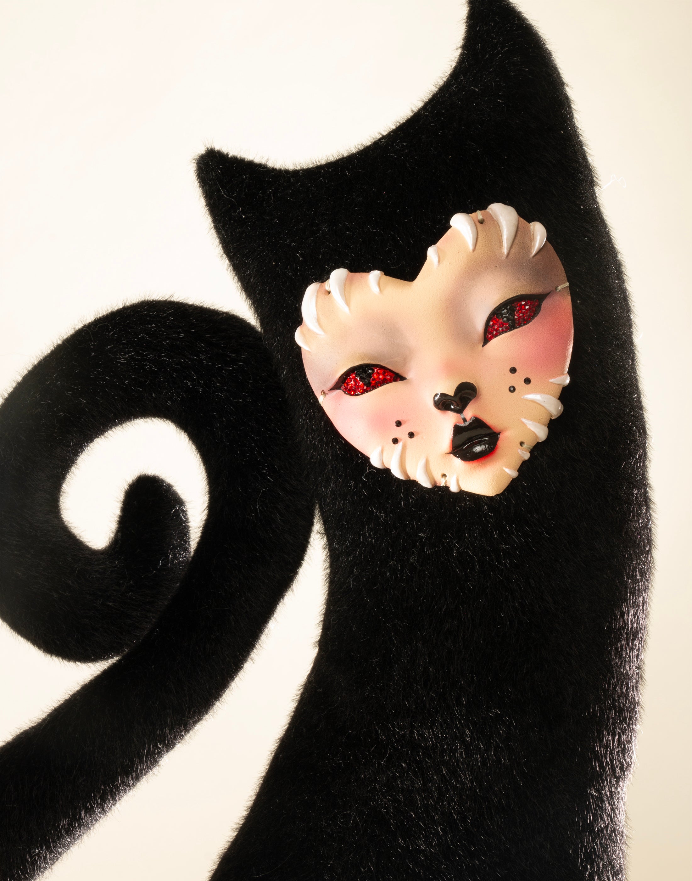 Original face sculpt: hand-cast resin; hand-painted with acrylic paint; crystal stoning. Plush body: hand-sewn faux-fur with jeweled rope; polyester fiber stuffing with polyester weighted beads at base.